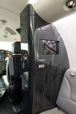 Chris Nelson and his team used hydrographic finish methods on the lavatory cabinet, vanity, aft dividers, pocket doors, drink rails, tables, left-hand forward galley, and right-hand forward entertainment cabinet with a design that was similar to a flat-cut walnut veneer with a grey background.