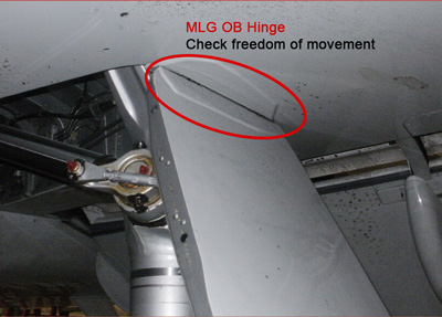 During the course of the last six months technicians at Duncan Aviation have found several MLG OB door hinges seized. With the aircraft jacked and the OB door to gear tie rod removed, retract the gear. Make sure that excessive force is not needed in the door movement and that it swings free throughout its full travel. Also during the next scheduled 1A inspection per task code 32-10-00-640-801, it is recommended that you liberally grease with lube oil in the hinge area.