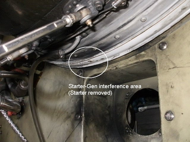 During installation of the #2 engine starter/generator on a Falcon 50B and 50EX, there is a possibility of interference between the V-Band clamp and the starter/generator at the 12:00 position of the starter/generator (see photo). Dassault offers a new style V-Band clamp, p/n F50B258708130 with a relief notch that provides clearance to prevent the interference (chaffing).