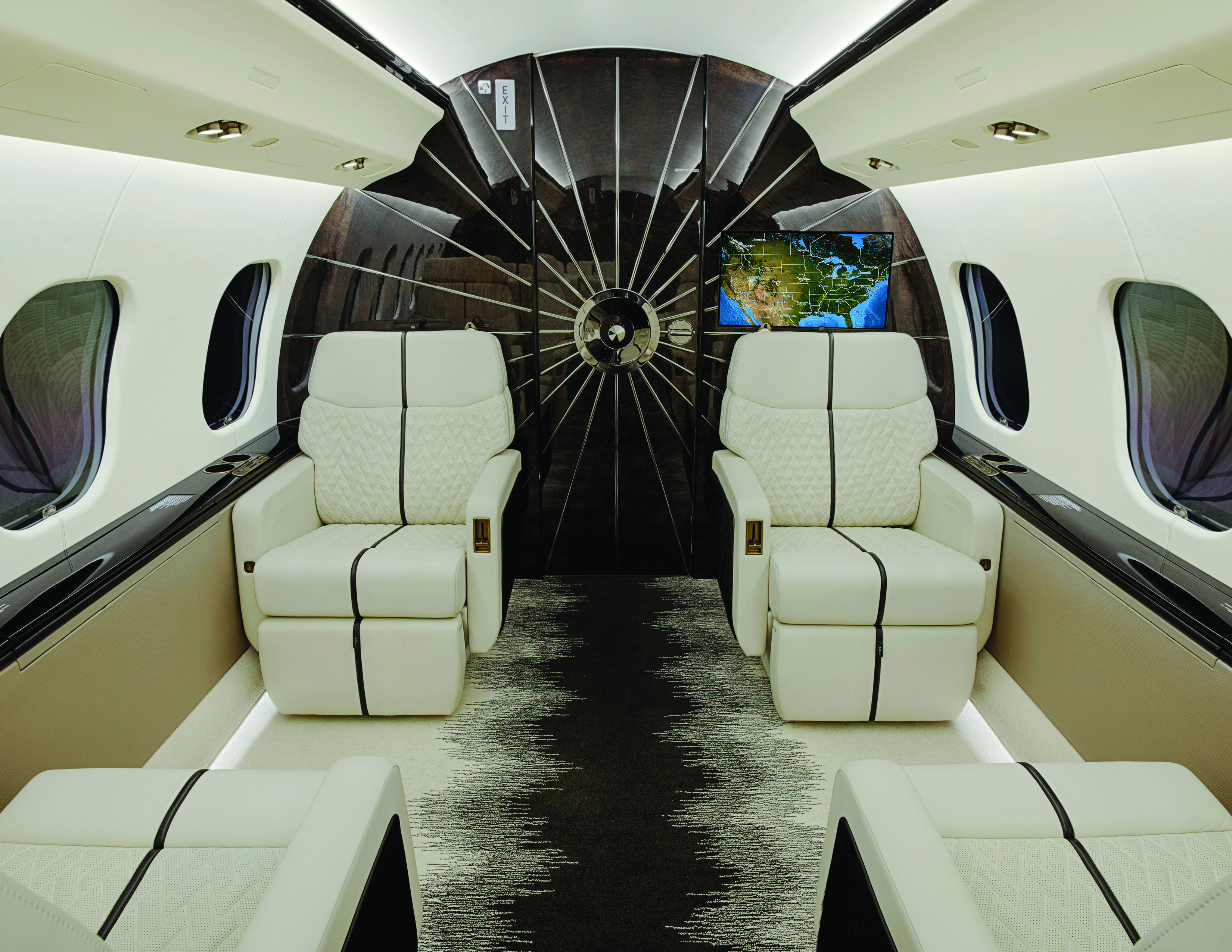 From the design specifications, Duncan Aviation’s Interior and Completion Shops built the spectacular starburst on the bulkhead divider. The resulting work of art demanded a delicate balance between the weight and durability of the materials, and the Interior team fit every contour and line so the starburst lines up perfectly when the door is closed.
