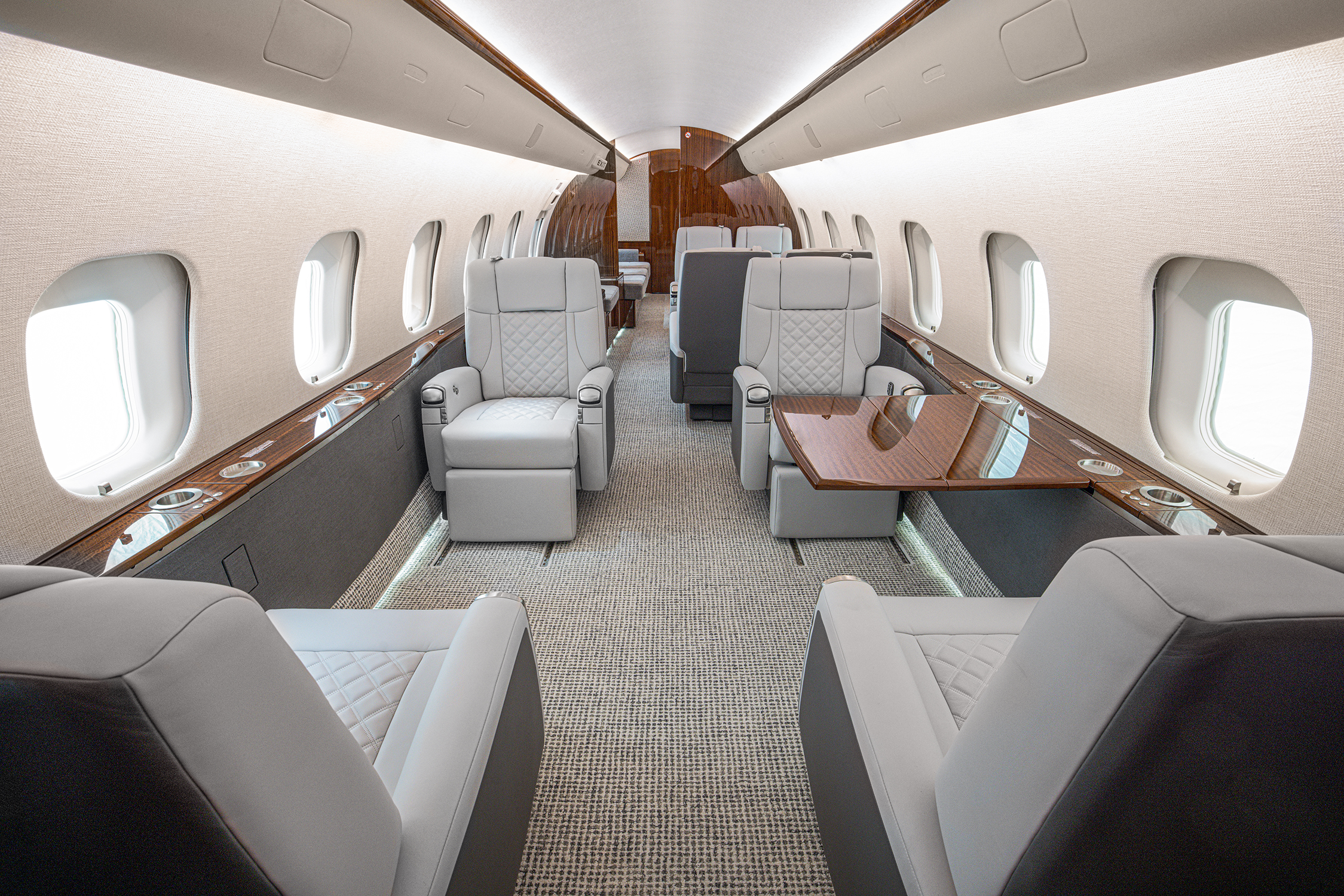“This pattern ties in beautifully with the veining and tones of the real wood veneer while balancing the aircraft’s grey accents, achieving a cohesive look with just the right amount of contrast,” Blanken adds.