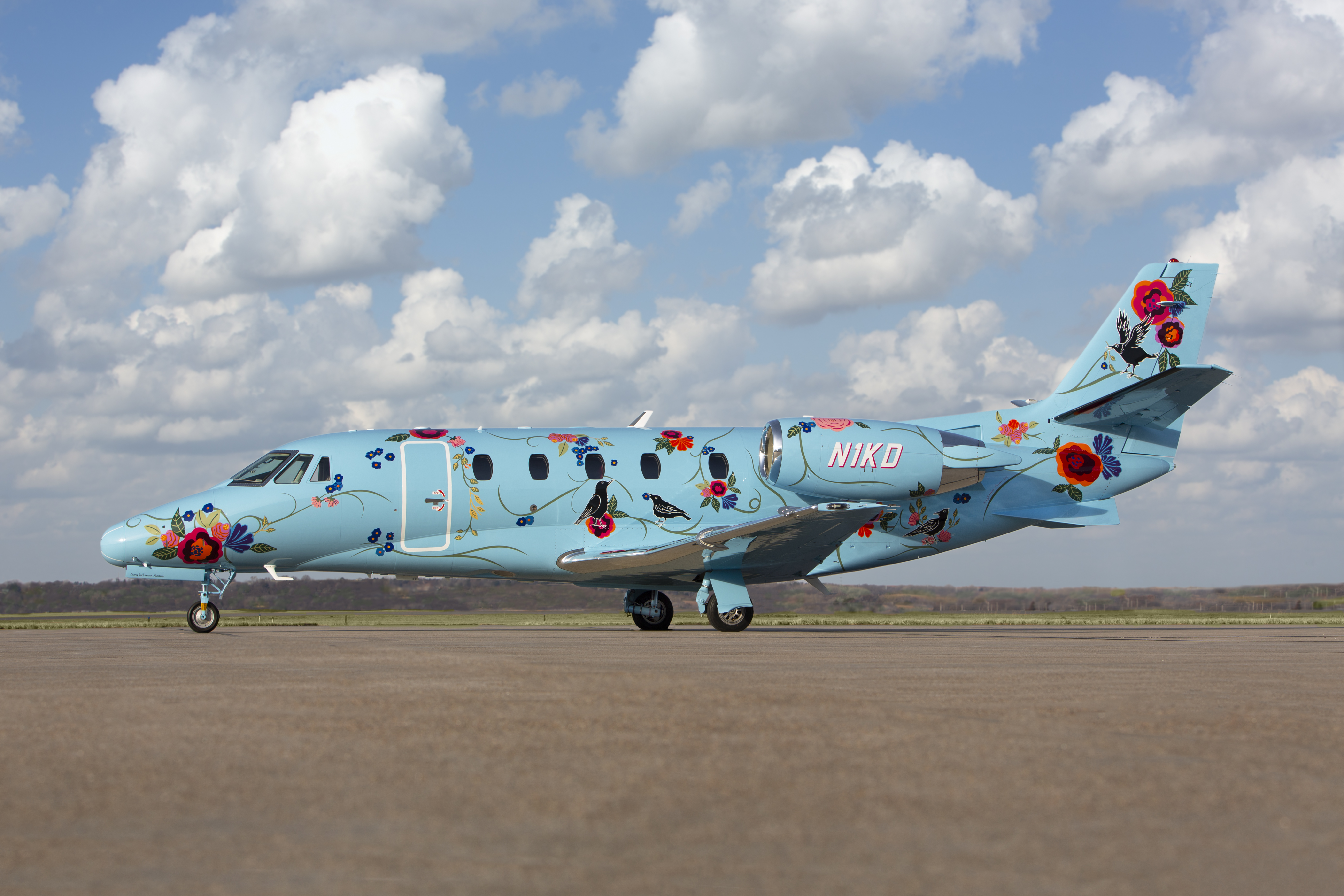 Teri Nekuda, Completions Designer with Duncan Aviation, has been instrumental in designing Duncan Aviation’s other unique exterior paint schemes including an orange and yellow plaid Citation Mustang, an apple green Citation M2 with red, blue, and yellow paint splotches, and a red and black Learjet 35A that was nicknamed “Spiderman Lear.” When Duncan Aviation purchased the 560XLS, she knew the team would be challenged to push the design envelope even further.