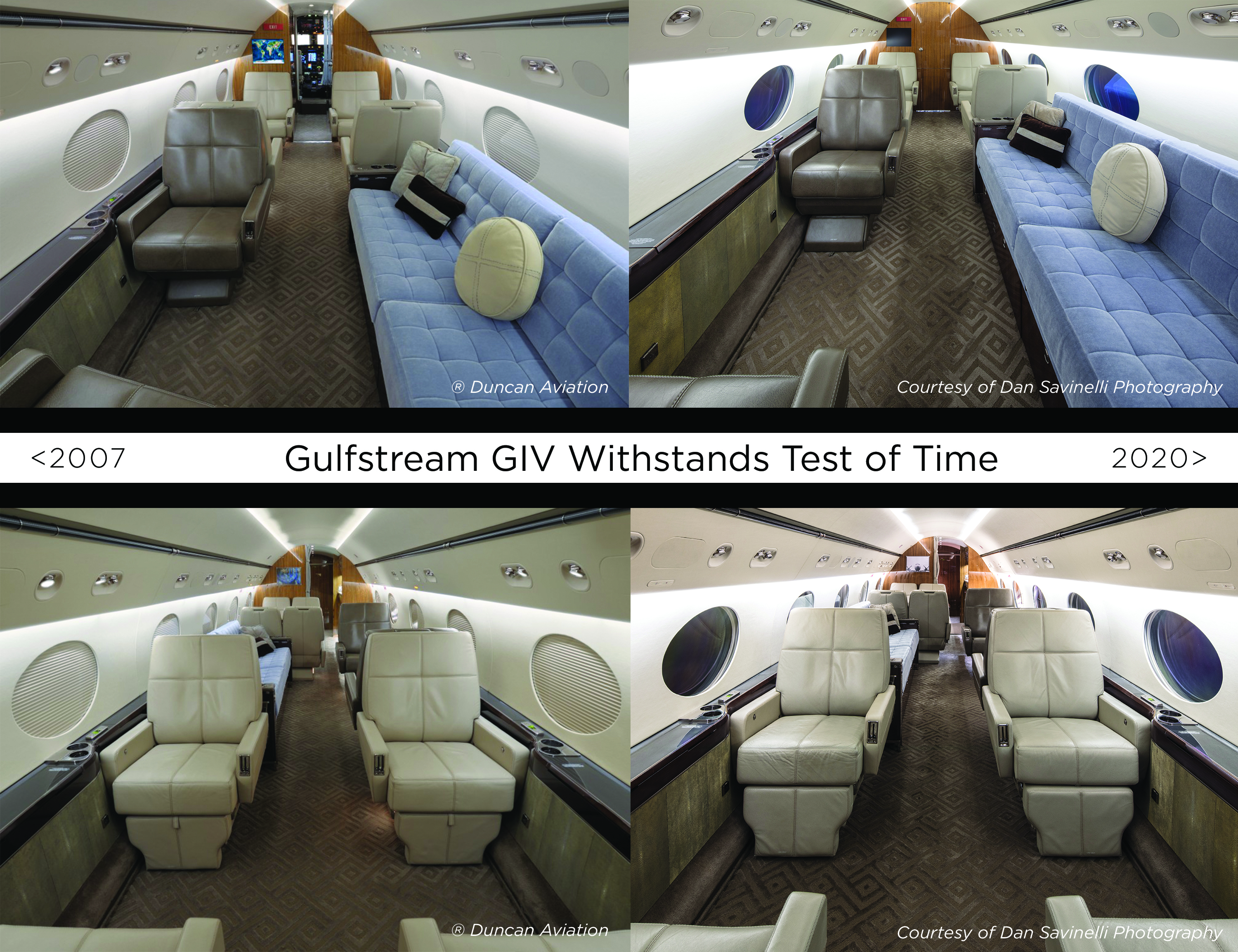 Case in point: Duncan Aviation completed a Gulfstream GIV in 2007 that was placed on static display at the National Business Aviation Association’s annual convention in Atlanta, Georgia. The aircraft had new paint as well as a fresh interior that showcased a multitude of industry firsts. A look at that aircraft today after 13 years of regular use, proves that its design was timeless and the interior installation and construction was of the highest quality.