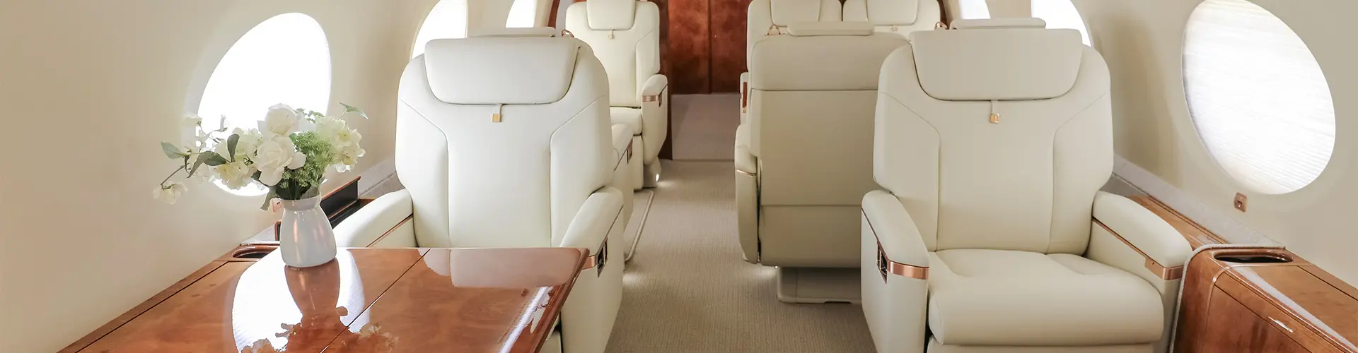 Interior of Gulfstream 650 with cream leather captain chairs