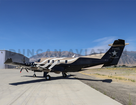 What began as an exploration into more modern, geometric paint schemes soon evolved into something deeply personal. The husband-and-wife owners initially leaned toward contemporary designs in black, taupe, and gold. However, inspired around the Fourth of July, they approached Duncan Aviation Senior Lead Designer Molly Pfeiffer with a bold new idea: a deconstructed American flag flowing seamlessly along the fuselage. The result is a PC-12 with an elegant, patriotic design. Subtle metallic taupe and gold complement deep black, while a hint of mint-blue around the stars and logo brings warmth and individuality. The tail features a large star surrounded by the words Family and Freedom, underscoring the personal meaning behind the project.